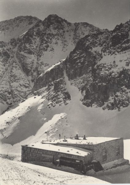 Schronisko Zbójnickie w Dolinie Staroleśnej w zimie. W tle od lewej: Sławkowski Szczyt, Sławkowska Kopa i grań Skrajnej Nowoleśnej Turni.
