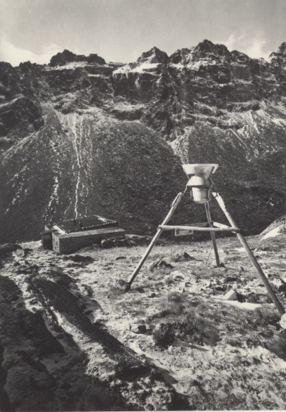 Widok na schronisko Zbójnickie w Dolinie Staroleśnej. W tle Sławkowska Grań i Nowoleśna Grań. Na pierwszym planie totalizator (przyrząd meteorologiczny do pomiaru sum opadów atmosferycznych).