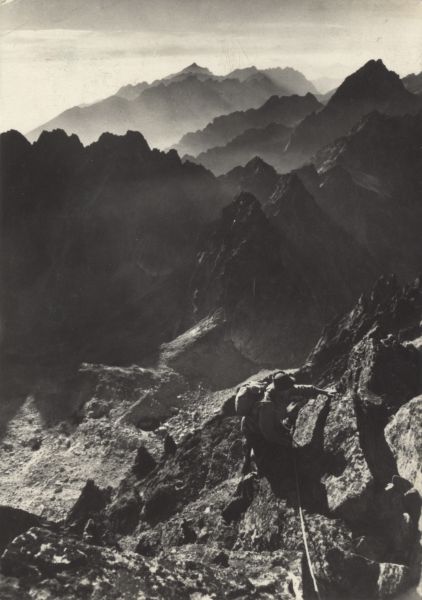 Na pierwszym planie taternik wspinający się po skałach. W tle po lewej Kończysta nad Doliną Batyżowiecką, z tyłu Krywań. Po prawej Wysoka.