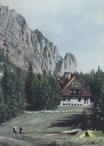 Schronisko na Hali Ornak w Dolinie Kościeliskiej. W tle Raptawicka Turnia. Na pierwszym planie z prawej namiot.