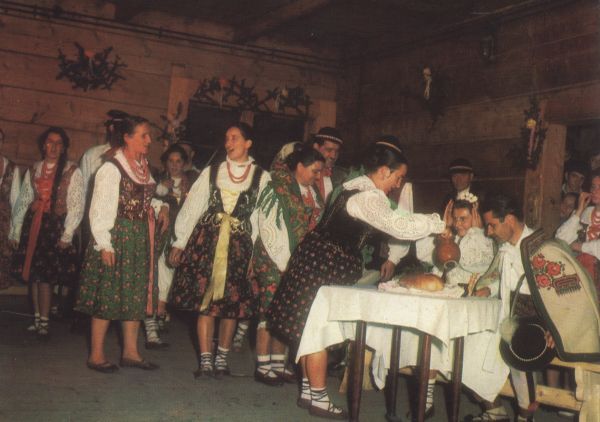 ZAKOPANE - JESIEŃ TATRZAŃSKA. Międzynarodowy Festiwal Folkloru Ziem Górskich. "Srebrne wesele góralskie" (obrzęd w izbie weselnej) w wykonaniu Zespołu Pieśni i Tańca im. Klimka Bachledy.