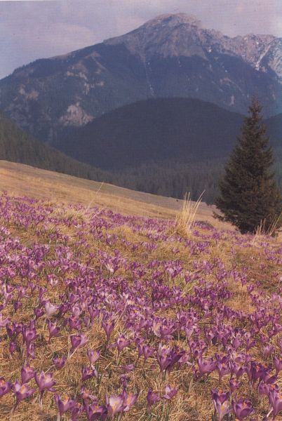 Krokusy (Crocus scepusiensis) na Polanie Chochołowskiej wiosną. W tle Kominiarski Wierch.