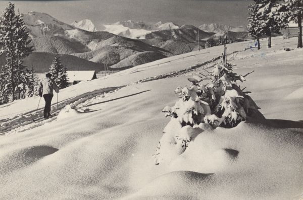 Narciarz na trasie na Gubałówce w zimie. W tle Tatry Zachodnie.