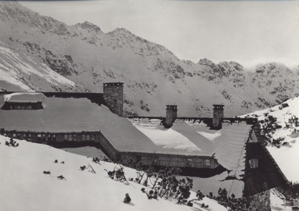 Schronisko w Dolinie Pięciu Stawów Polskich w zimie. W tle Miedziane i Szpiglasowy Wierch.