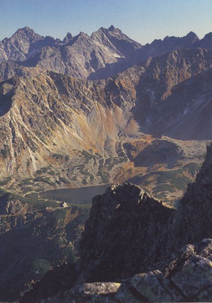 Widok z Granatów do Doliny Pięciu Stawów Polskich. Nad Przednim Stawem Polskim widoczne schronisko. Nad nim z lewej Opalony Wierch, z prawej Miedziane. W tle Wysoka i Rysy.