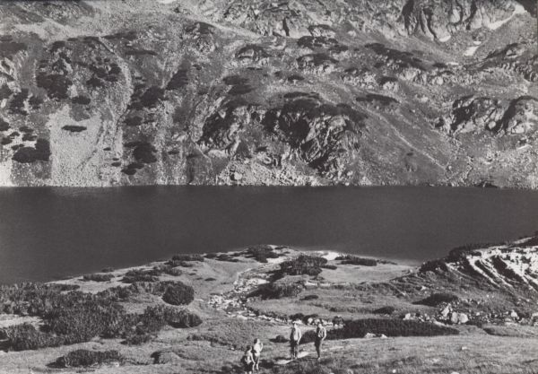 Wielki Staw Polski w Dolinie Pięciu Stawów Polskich. Na pierwszym planie stoją turyści.