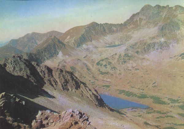 Widok ze Szpiglasowej Przełęczy na Dolinę Pięciu Stawów Polskich. W dole Czarny Staw Polski, nad nim Zadni Staw Polski. W tle Gładki Wierch, Walentkowy Wierch i Świnica.