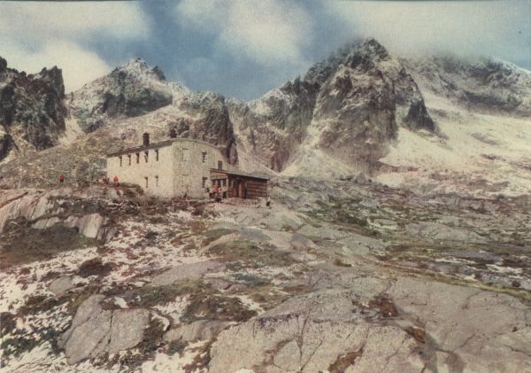 Schronisko Téryego w Dolinie Pięciu Stawów Spiskich. W tle Mały Lodowy Szczyt i Lodowa Kopa.