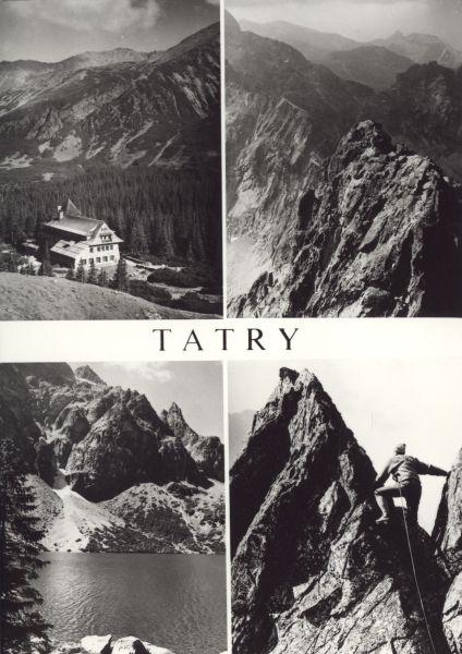 Taternik na grani. Pomiędzy zdjęciami napis: TATRY.