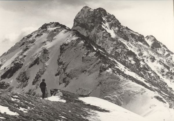 Widok na Świnicę z Beskidu w zimie. Na pierwszym planie turysta.