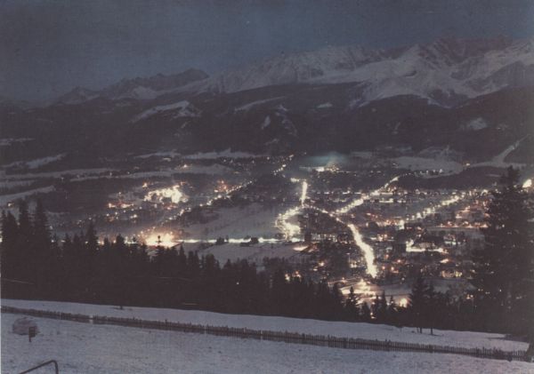 Widok ogólny na Zakopane z Gubałówki nocą w zimie.