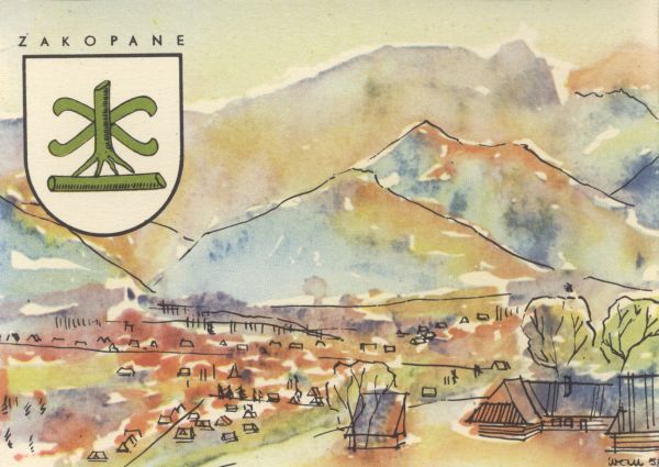 Reprodukcja akwareli A., B. i M. Wochna przedstawiającej Zakopane i jego herb.