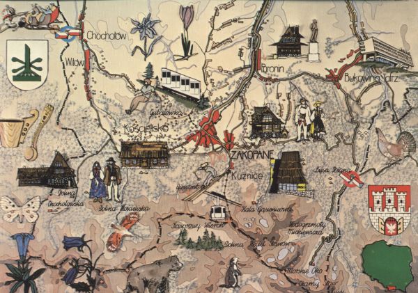Mapa schematyczna Zakopanego i Tatr z zaznaczonymi atrakcjami turystycznymi.
