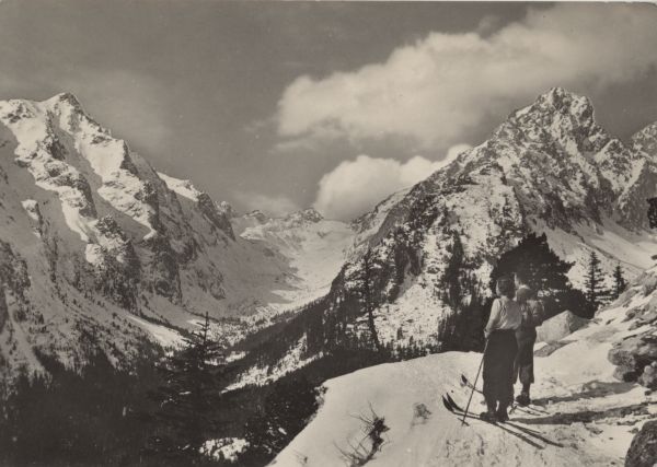 Na pierwszym planie dwoje narciarzy. W tle Dolina Staroleśna i fragment Doliny Małej Zimnej Wody oraz Sławkowski Szczyt i Pośrednia Grań w zimowej scenerii.