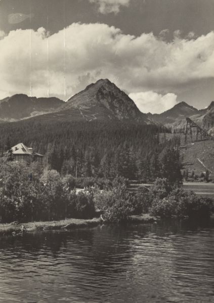 Na pierwszym planie Szczyrbskie Jezioro. W głębi po lewej stronie willa Marina. W tle Wielkie Solisko i Szczyrbski Szczyt. Po prawej widać również star± skocznię narciarsk±.