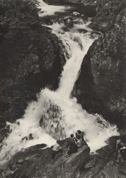 Wodogrzmoty Mickiewicza w Dolinie Roztoki. W dole na skale siedzą turyści.