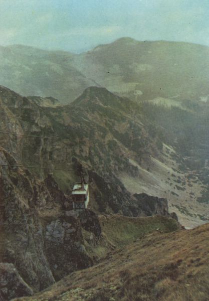 Widok z Kasprowego Wierchu na wagonik kolei linowej. W dole Sucha Dolina Kasprowa.