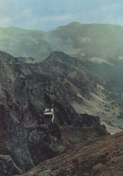 Widok z Kasprowego Wierchu na wagonik kolei linowej. W dole Sucha Dolina Kasprowa.