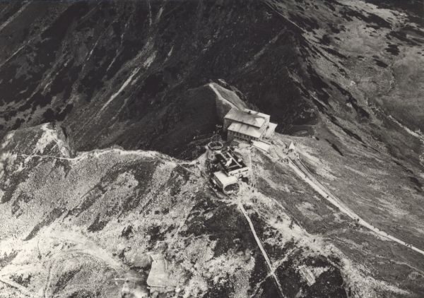 Widok z samolotu na Kasprowy Wierch: górna stacja kolei linowej i obserwatorium meteorologiczne.