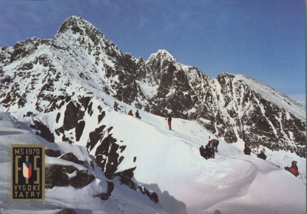 Narciarze na £omnickim Grzebieniu zim±. W tle £omnica, Kieæmarski Szczyt i Huncowski Szczyt. W lewym dolnym rogu logo FIS MS 1970.