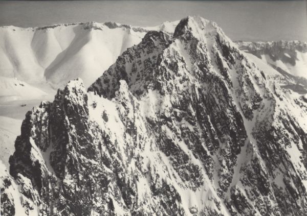 Widok z Łomnicy na Kieżmarski Szczyt w zimie. W tle grań Tatr Bielskich.