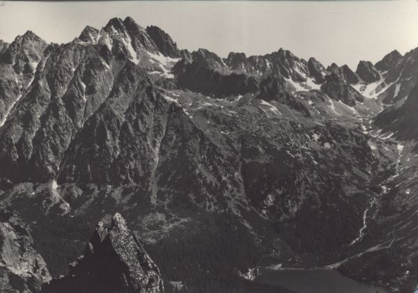 Tatry Wysokie. Widok ze Skrajnej Baszty ponad Popradzki Staw i Dolinę Złomisk na główną grań Tatr Wysokich: z lewej Rysy, Wysoka (w środku) i Żłobisty Szczyt.