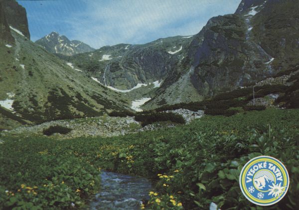 Dolina Małej Zimnej Wody w lecie. W tle Lodowa Kopa i Lodowy Szczyt. Na pierwszym planie potok Mała Zimna Woda. Na dole w prawym rogu logo miasta VYSOKÉ TATRY.