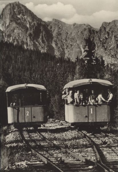 Wagoniki kolei linowo - torowej ze Starego Smokowca na Siodełko podczas mijania. W tle Łomnica.