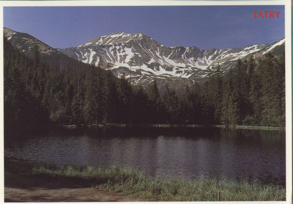 Smreczyński Staw w Dolinie Kościeliskiej. W tle Bystra. U góry po prawej stronie nadruk: TATRY.