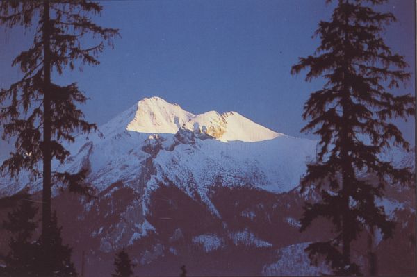 Słońce na ośnieżonych szczytach tatrzańskich.