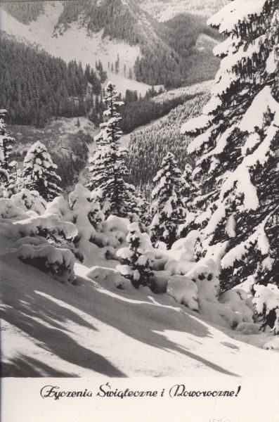 Kalatówki w zimie. Pod zdjęciem nadruk: Życzenia Świąteczne i Noworoczne.