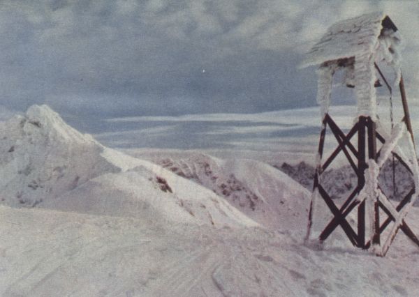 Widok z Kasprowego Wierchu na Świnicę, Beskid i Walentkowy Wierch w zimie. Z prawej na pierwszym planie dzwon.