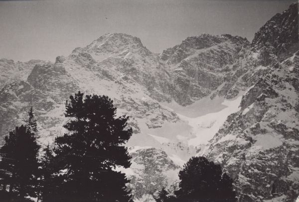 Mięguszowiecki Szczyt Czarny, Mięguszowiecka Przełęcz pod Chłopkiem i Mięguszowiecki Szczyt Pośredni nad Morskim Okiem w zimie. Na pierwszym planie limby (Pinus cembra L.).