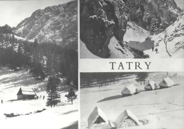 Pocztówka 3. elementowa: Szałas na Polanie Strążyskiej zimą. Dolina Białego w zimie. Szałasy na Polanie Kalatówki w zimie.