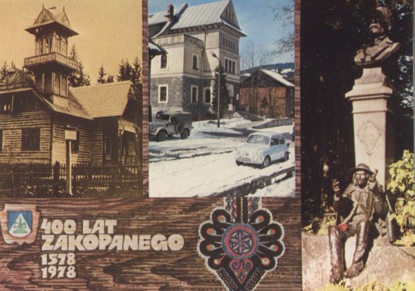 Pocztówka 3. elementowa: Pierwszy własny budynek Muzeum Tatrzańskiego. Obecny budynek Muzeum Tatrzańskiego im. Dra Tytusa Chałubińskiego. Pomnik dr Tytusa Chałubińskiego.