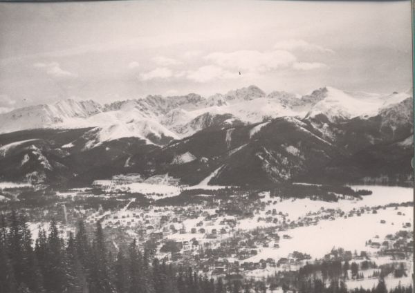 Widok ogólny na Zakopane z Gubałówki w zimie. W tle panorama Tatr Wysokich.