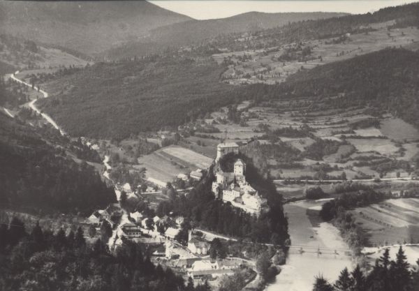 Widok ogólny na Orawskie Podzamcze. Pośrdoku Zamek Orawski, dołem płynie rzeka Orawa.