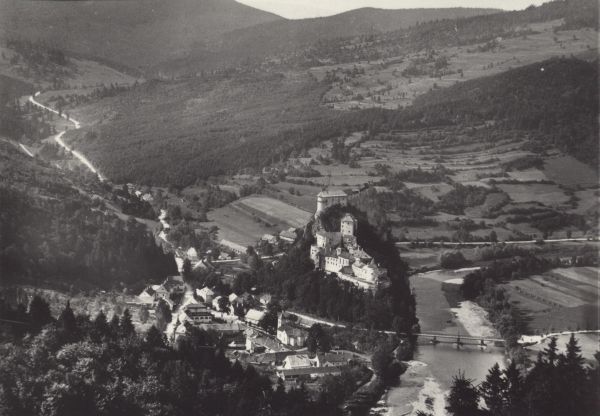 Widok ogólny na Orawskie Podzamcze. Pośrdoku Zamek Orawski, dołem płynie rzeka Orawa.