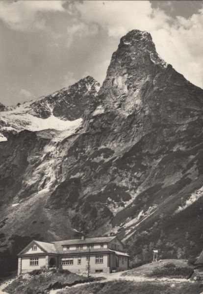 Budynek schroniska przy Zielonym Stawie. Za nim wznosi się Jastrzębia Turnia, na lewo Kołowy Szczyt.