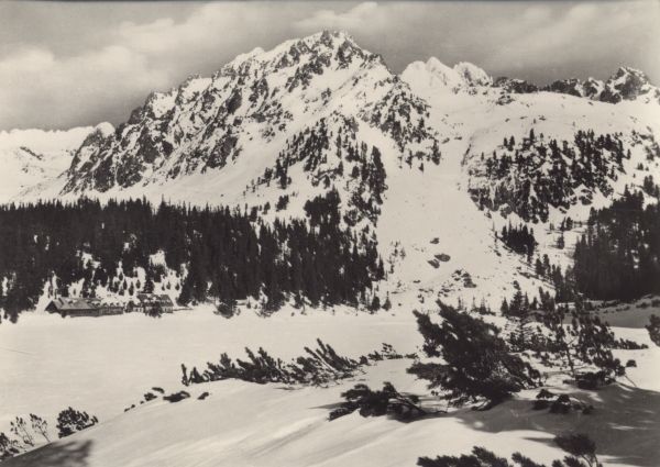 Popradzki Staw w Dolinie Mięguszowieckiej w zimie. Nad brzegiem widoczne schronisko. W tle Wołowy Grzbiet, Popradzka Kopa, Wysoka, Ganek, Rumanowy Szczyt i Żłobisty Szczyt.
