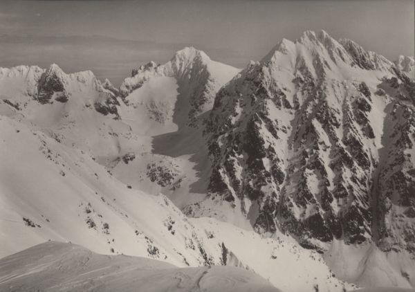 Widok z Grani Baszt na Wołowy Grzbiet, Wołowa Turnia, Żabi Koń, Rysy i Wysoką zimą.