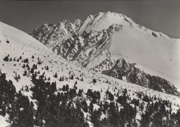 Tatry Wysokie - widok od zachodu na grań Kończystej (z lewej Mała Kończysta). Z prawej w dole skalne zbocze Osterwy. Tytuł również w j. ros., niem., ang.