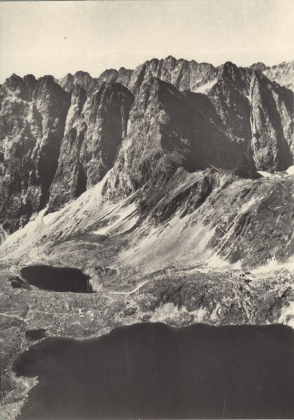 Widok z Mięguszowieckiej Przełęczy pod Chłopkiem na Wielki i Mały Hińczowy Staw. W tle od lewej Zadnia Baszta, Mała i Wielka Capia Turnia, Hlińska Turnia i Szczyrbski Szczyt.