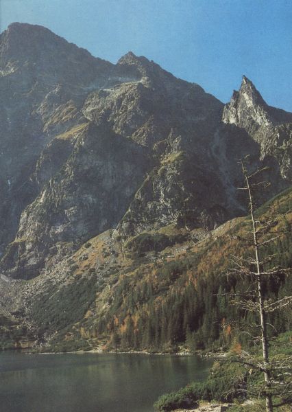 TATRY WYSOKIE. Morskie Oko (1393 m), w głębi Mnich (2068 m), Cubryna (2376 m) i Mięguszowiecki Szczyt (2438 m).