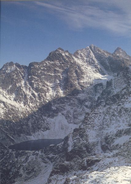 Widok na Czarny Staw pod Rysami z Dolinki za Mnichem zimą. Nad nim Niżnie Rysy i Rysy.