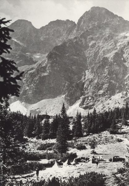 Mięguszowiecki Szczyt Czarny, Mięguszowiecka Przełęcz pod Chłopkiem, Mięguszowiecki Szczyt Pośredni i Mięguszowiecki Szczyt Wielki nad Morskim Okiem w Dolinie Rybiego Potoku. W przodzie obozowisko turystyczne.