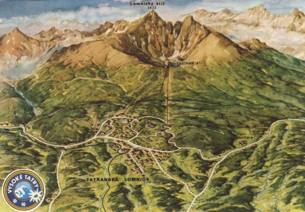 Tatrzańska Łomnica. Mapa perspektywiczną autorstwa Vorela przedstawiająca Tatrzańską Łomnicę u podnóża Łomnicy. Na mapie zaznaczono ponadto: Łomnicki Staw i Tatrzańskie Matliary, oraz drogi i trasę kolei linowej na Łomnicę. W lewym dolnym rogu logo miasta: WYSOKIE TATRY.