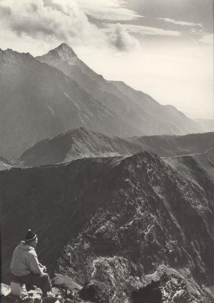 Widok ze Świnicy na Walentkowy Wierch, Cichy Wierch i Krywań. W lewym dolnym rogu zdjęcia turysta na szczycie Świnicy.