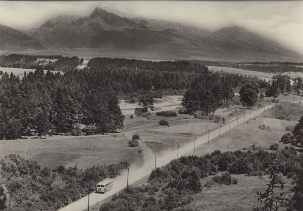 Widok na Krywań i Gerlach z Liptowskiego Gródka. Na pierwszym planie droga i jad±cy po niej autobus.