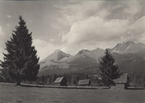 Widok z Ważeckich ٱk: Krywań, Krótka, w tyle Ostra, z przodu Siodełkowa Kopa, Furkot i Wielkie Solisko. Na polanie szałasy pasterskie.